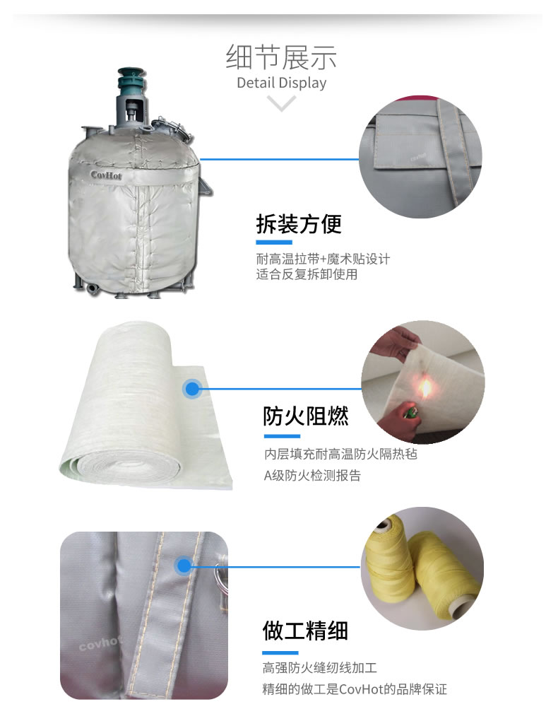 工業(yè)罐體保溫套無(wú)需專業(yè)保溫人員,無(wú)需專業(yè)培訓(xùn),操作簡(jiǎn)單快速,表層纖維布不含石棉成分,防油、防水性能優(yōu)良,無(wú)纖維飛散問(wèn)題,環(huán)保、安全、衛(wèi)生。隔熱保溫效果佳,耐溫可達(dá)1170度。具有易操作,節(jié)省維護(hù)時(shí)間和保溫成本。光澤、平整、美觀、使用壽命長(zhǎng)、防雨、防酸堿、抗老化,柔軟,拆卸方便,重復(fù)使用,節(jié)能環(huán)保。解決了經(jīng)常拆卸部位難以重新保溫的問(wèn)題,減少了能源浪費(fèi)。